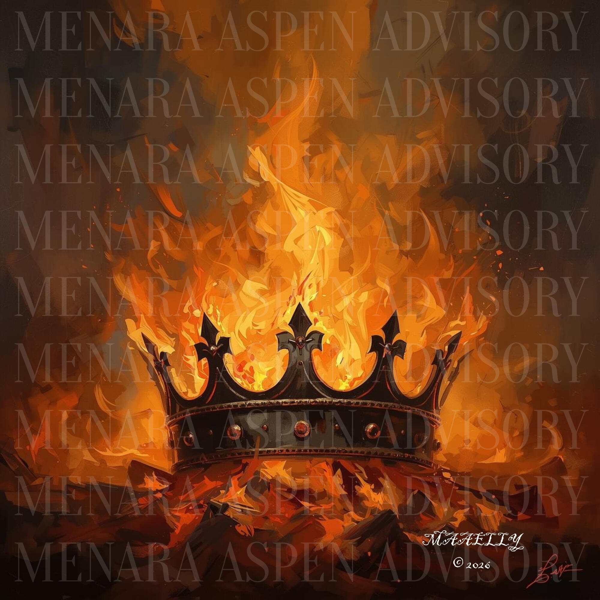 The illustration carries the mood of English historical imagery—royalty, legacy, downfall—yet rendered with a modern, expressive edge. It evokes themes of sovereignty under threat, the burning away of old orders, or the fierce transformation of something once untouchable. The result is a piece that feels both traditional and mythic, like a lost plate from an illuminated chronicle or a visual metaphor from a Shakespearean tragedy.
